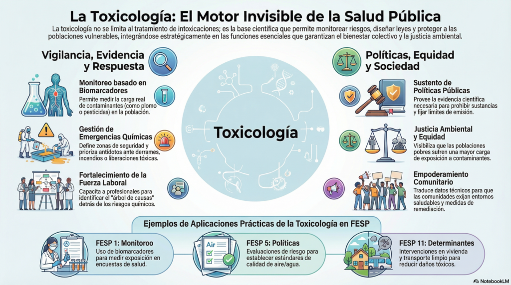 FESP 9: Investigación, innovación y evaluación en Salud Pública, donde la Toxicología tiene un doble papel. Por un lado, genera conocimiento nuevo sobre sustancias emergentes, tales como nanomateriales, residuos de fármacos en el agua de riego y el ambiente en general, disruptores endócrinos, nuevos plaguicidas o mezclas complejas de químicos. Por otro, ofrece métodos para evaluar el impacto de las políticas implementadas. Por ejemplo, compara niveles de plomo en sangre antes y después de su eliminación de artículos de consumo (combustibles, pinturas), o mide cambios en la incidencia de intoxicaciones tras la regulación de un pesticida específico. Esta retroalimentación es esencial para ajustar y mejorar las intervenciones en salud pública.